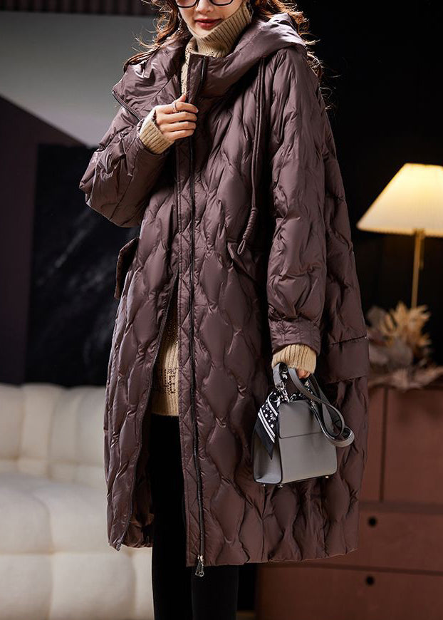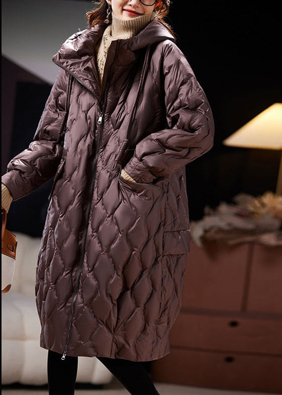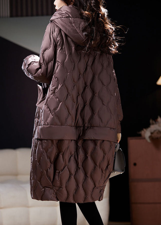 Loose Coffee Hooded Pockets Duck Down Coat Winter