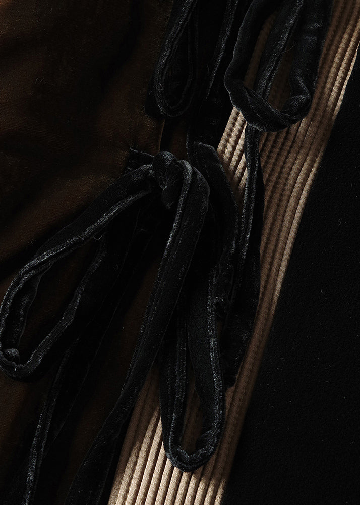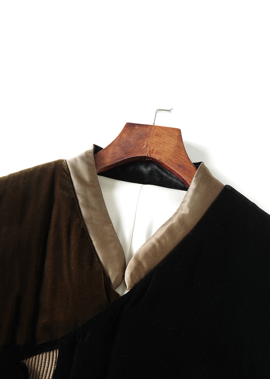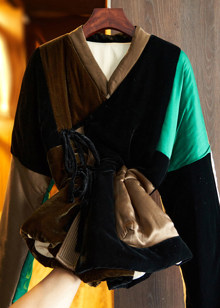 Loose Colorblock Lace Up Pockets Patchwork Silk Velour Parka Winter