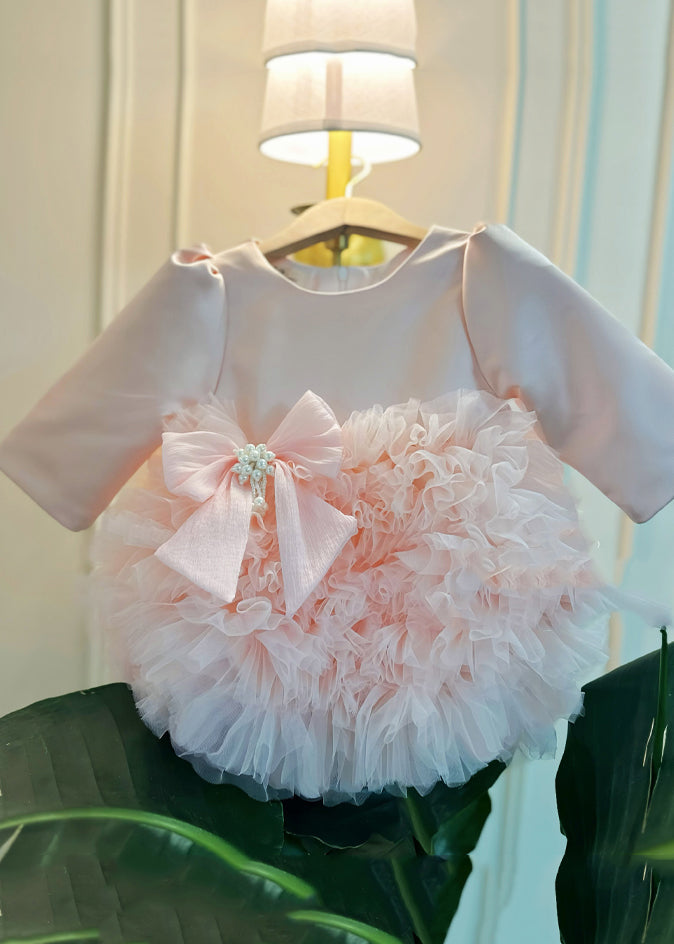 Lovely Pink Bow Pearl Tulle Kids Maxi Dress Spring