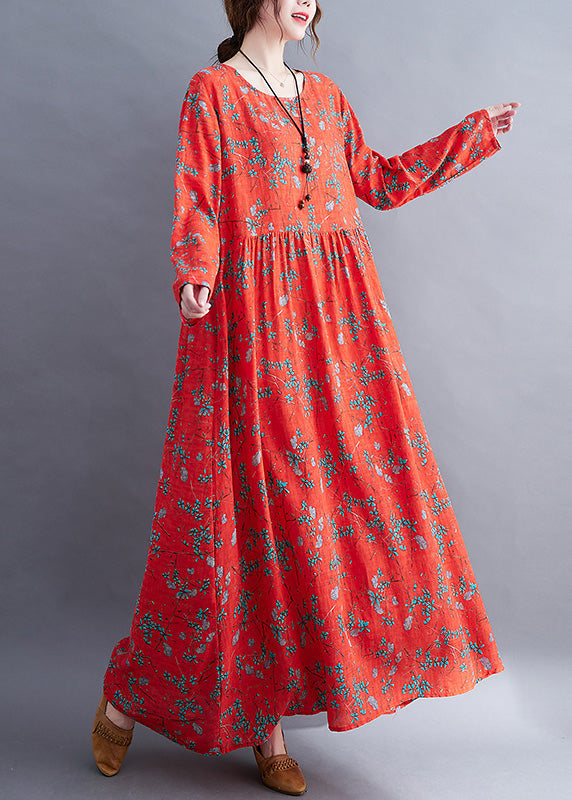 Natural Red O-Neck Print Maxi Dress Long Sleeve