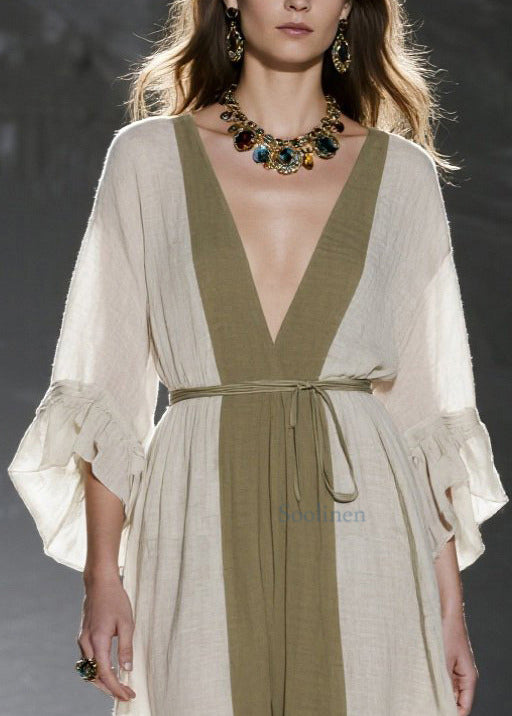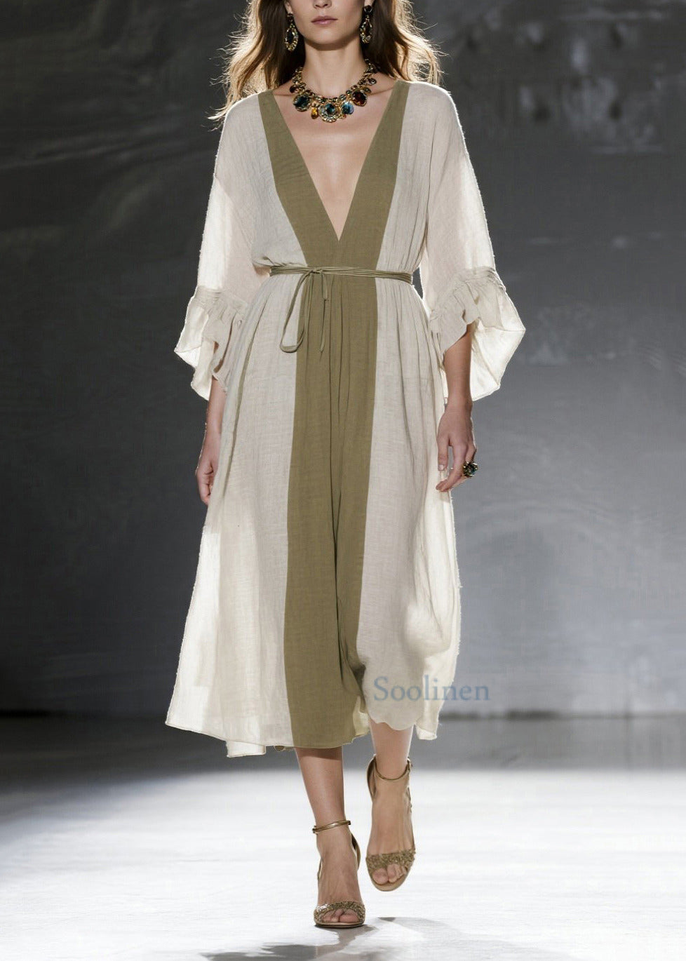 Natural White V Neck Patchwork Cotton Tunic Dresses Summer