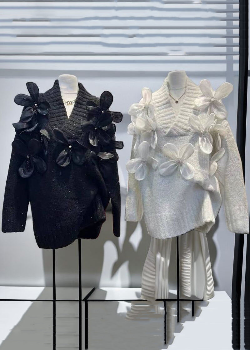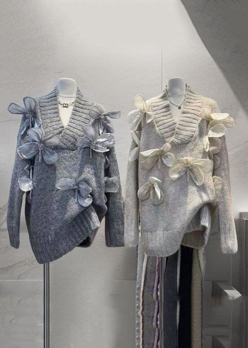New Apricot V Neck Floral Patchwork Knit Sweaters Winter