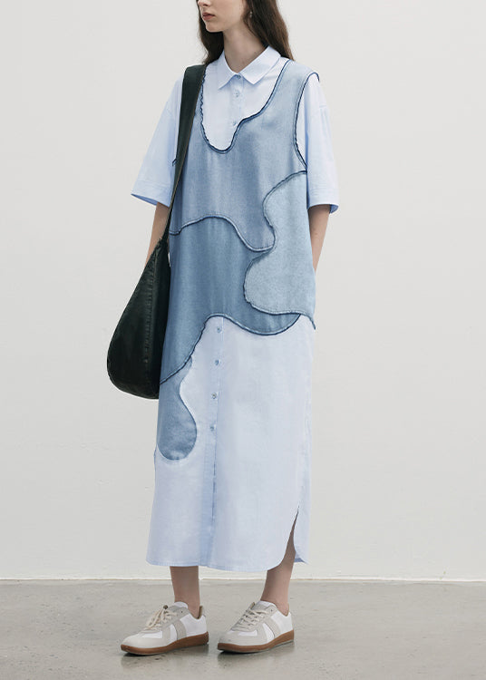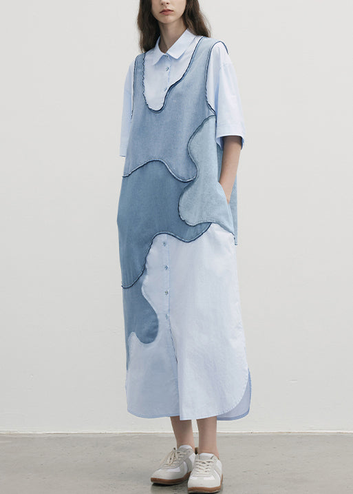 New Blue Peter Pan Collar Patchwork Cotton Shirts Dresses Summer