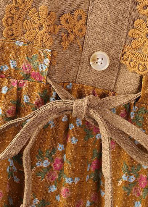 New Green Print Tie Waist Patchwork Cotton Dress Long Sleeve
