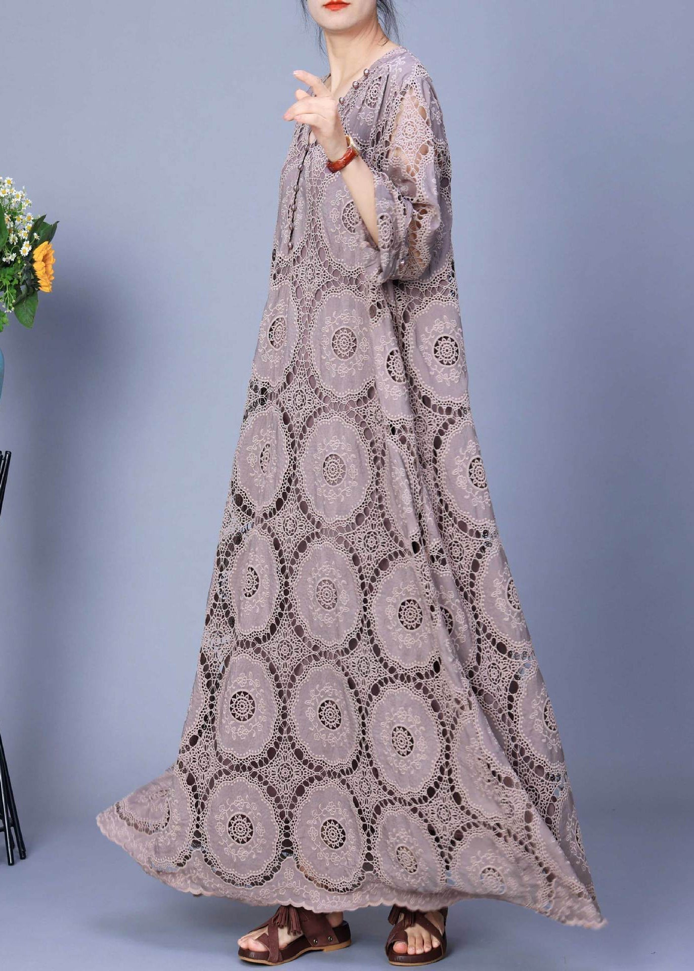 New Purple V Neck Button Hollow Out Cotton Dress Long Sleeve