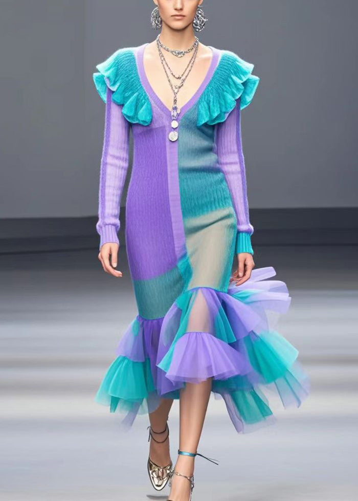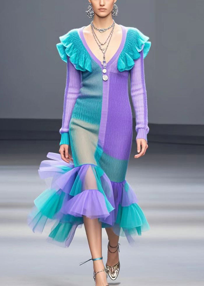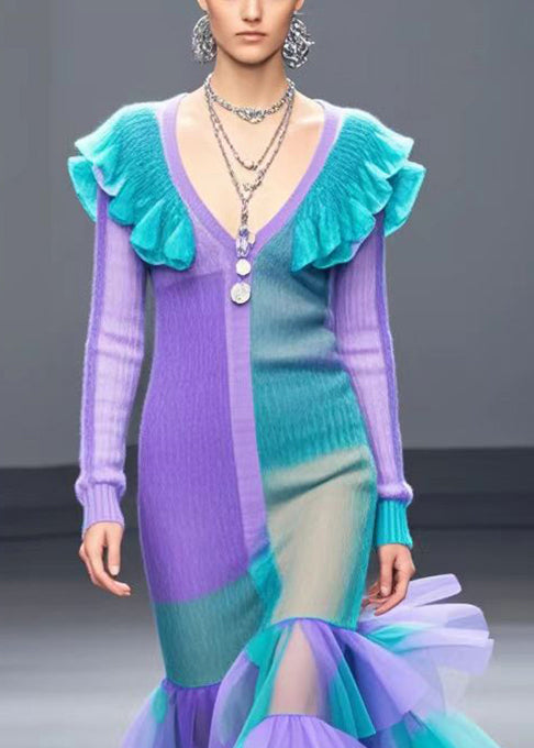 Organic Gradient Color Ruffled Patchwork Knitted Wraped Dress Winter