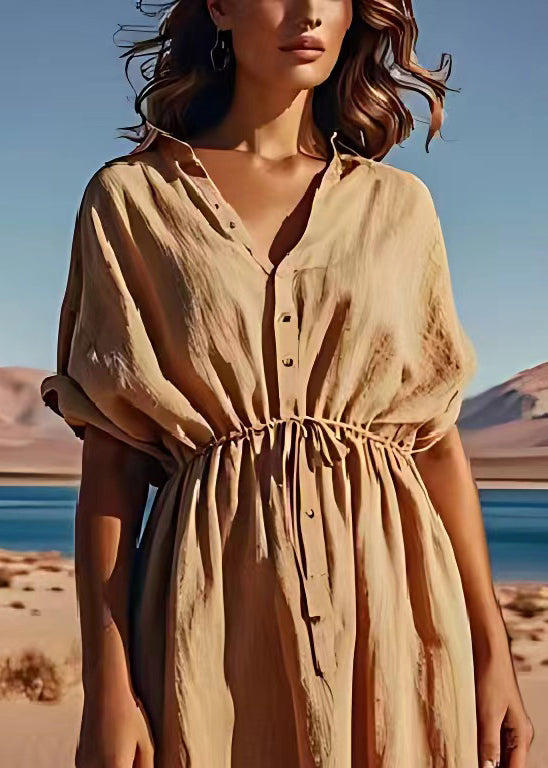 Organic Khaki Drawstring Button Patchwork Linen Dress Summer