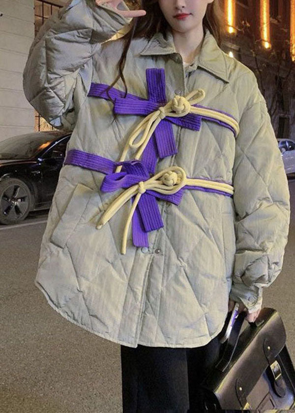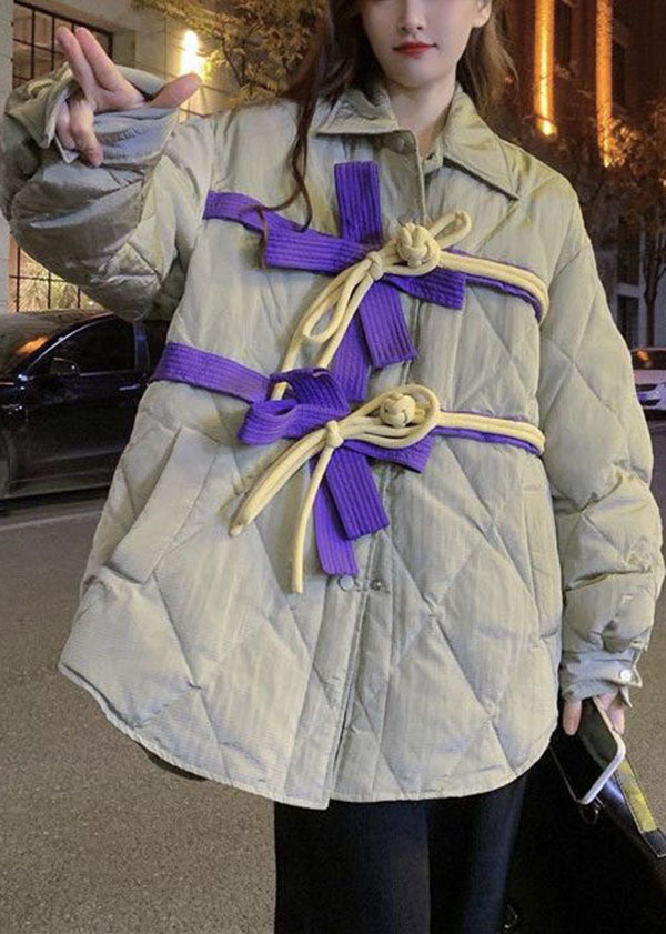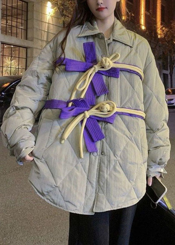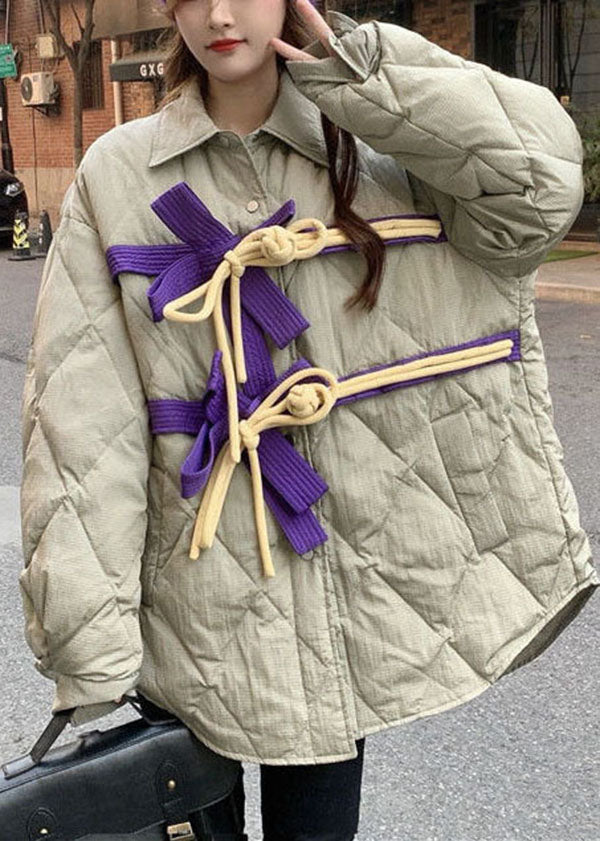 Original Design Khaki Peter Pan Collar Bow Oriental Button Thick Coats Winter