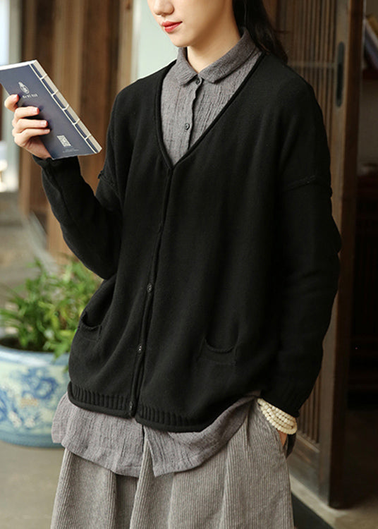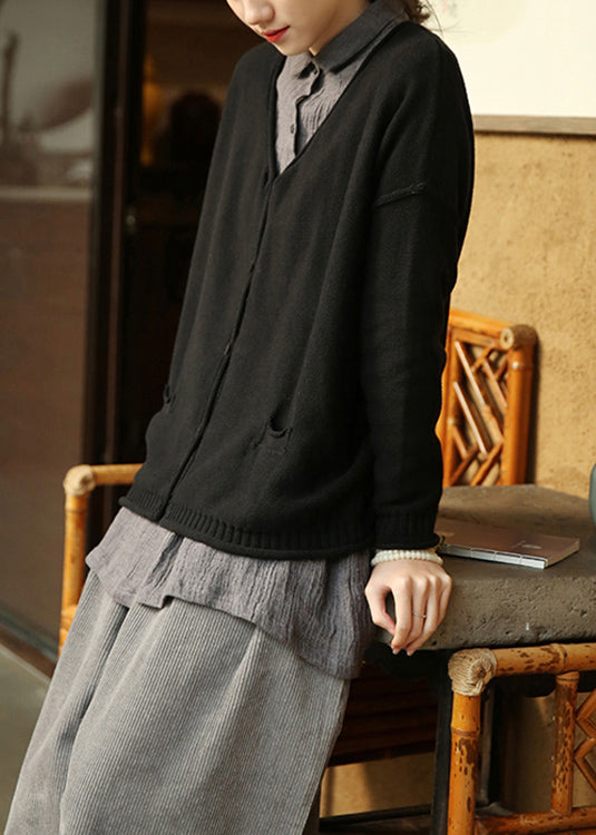 Plus Size Black Button Pockets Patchwork Knit Cardigan Fall