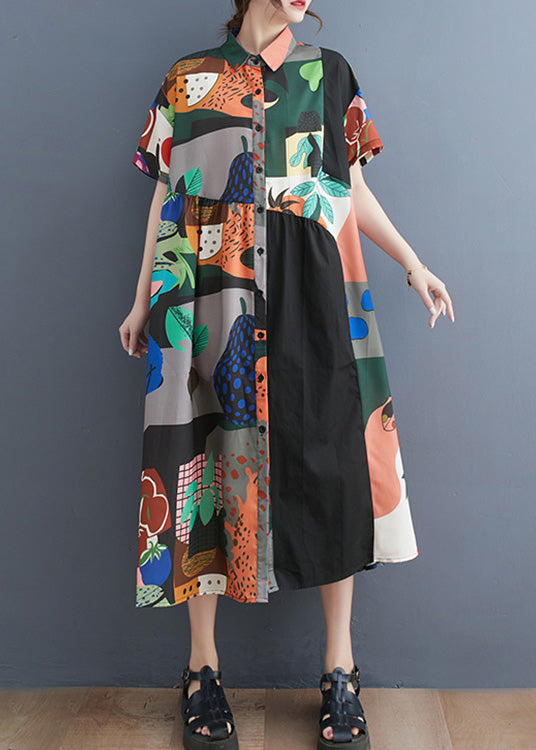 Plus Size Black Peter Pan Collar Print Button Party Long Shirts Dress Short Sleeve