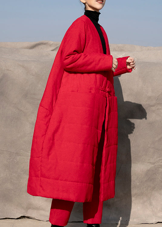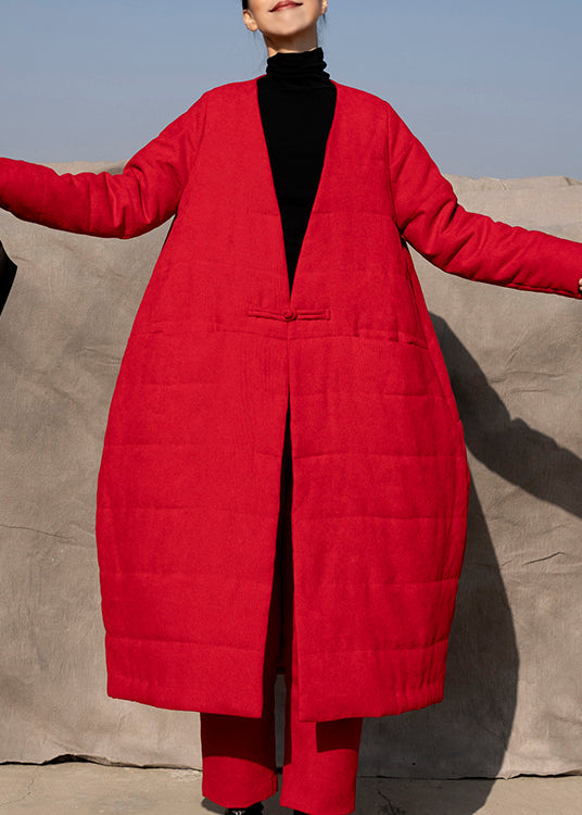 Plus Size Black V Neck Chinese Button Fine Cotton Filled Coat Winter