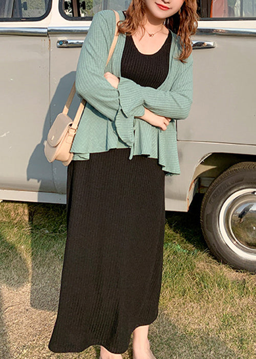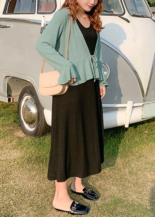 Plus Size Green Lace Up Patchwork Knit 2 Piece Outfit Flare Sleeve