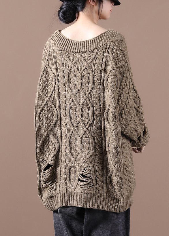 Plus Size Khaki V Neck Cotton Knit Sweaters Fall