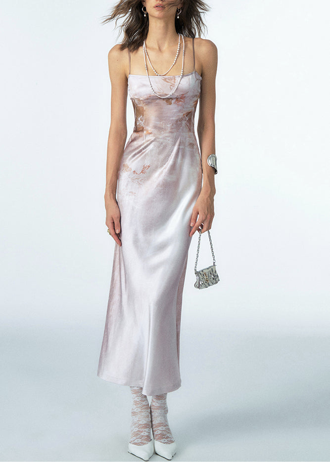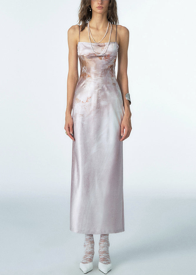 Slim Fit Coffee Print Side Open Silk Spaghetti Strap Dress Sleeveless