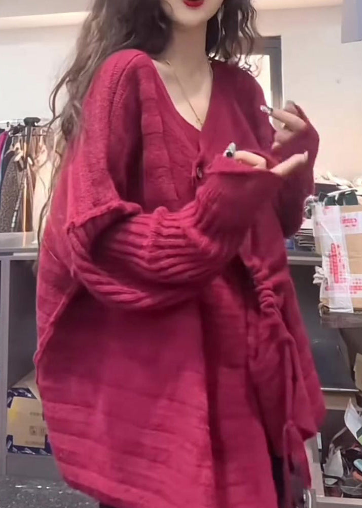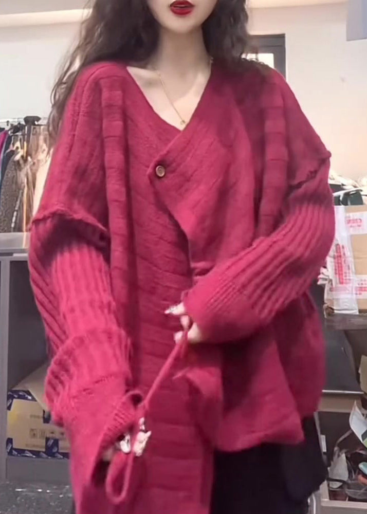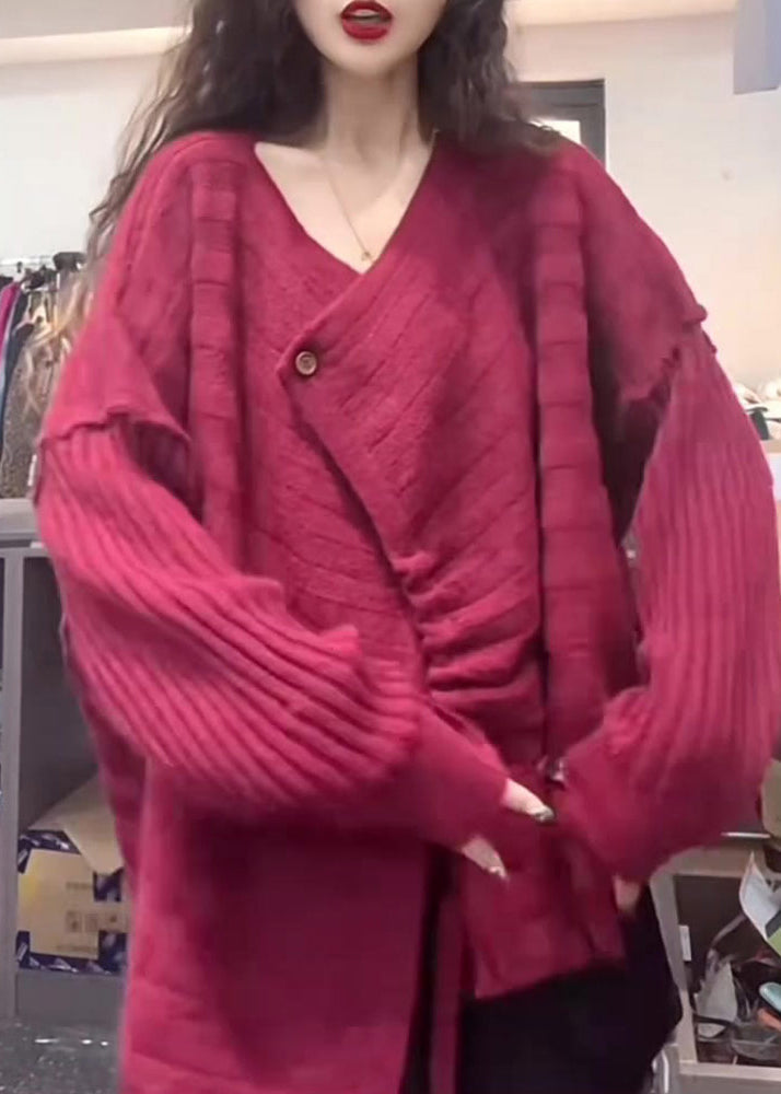 Style Rose V Neck Cinched Asymmetrical Patchwork Knit Top Fall