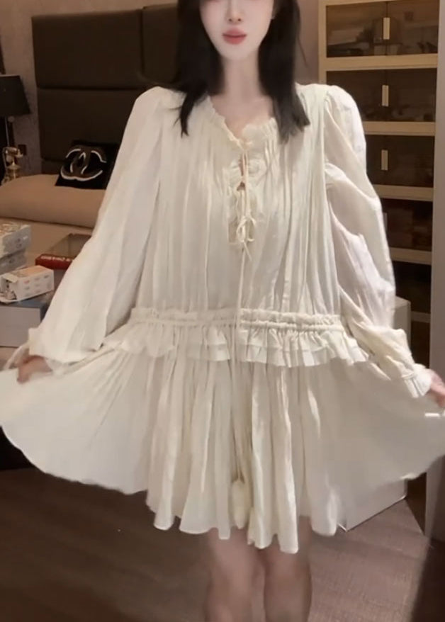 Stylish Apricot Ruffled Lace Up Solid Chiffon Mini Dress Fall