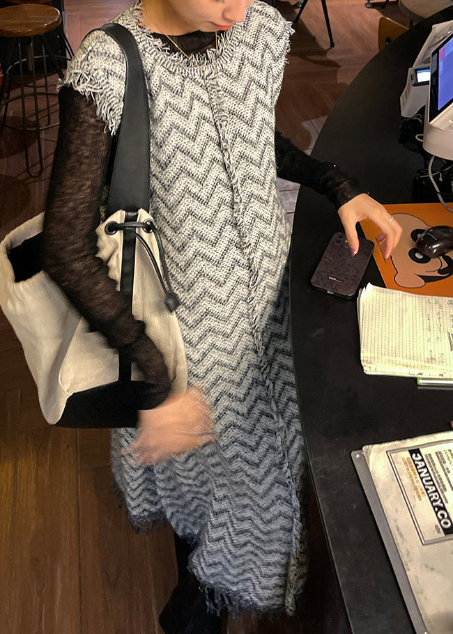 Stylish Blue Tasseled Knit Vest Dress Sleeveless