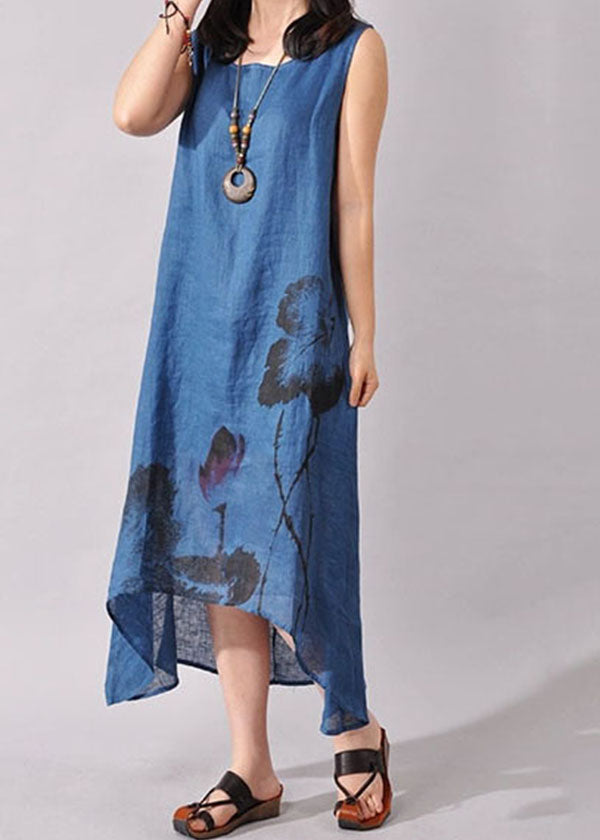 Vintage Blue Women Folk Style Ink Painting Floral Sleeveless Dress Summer