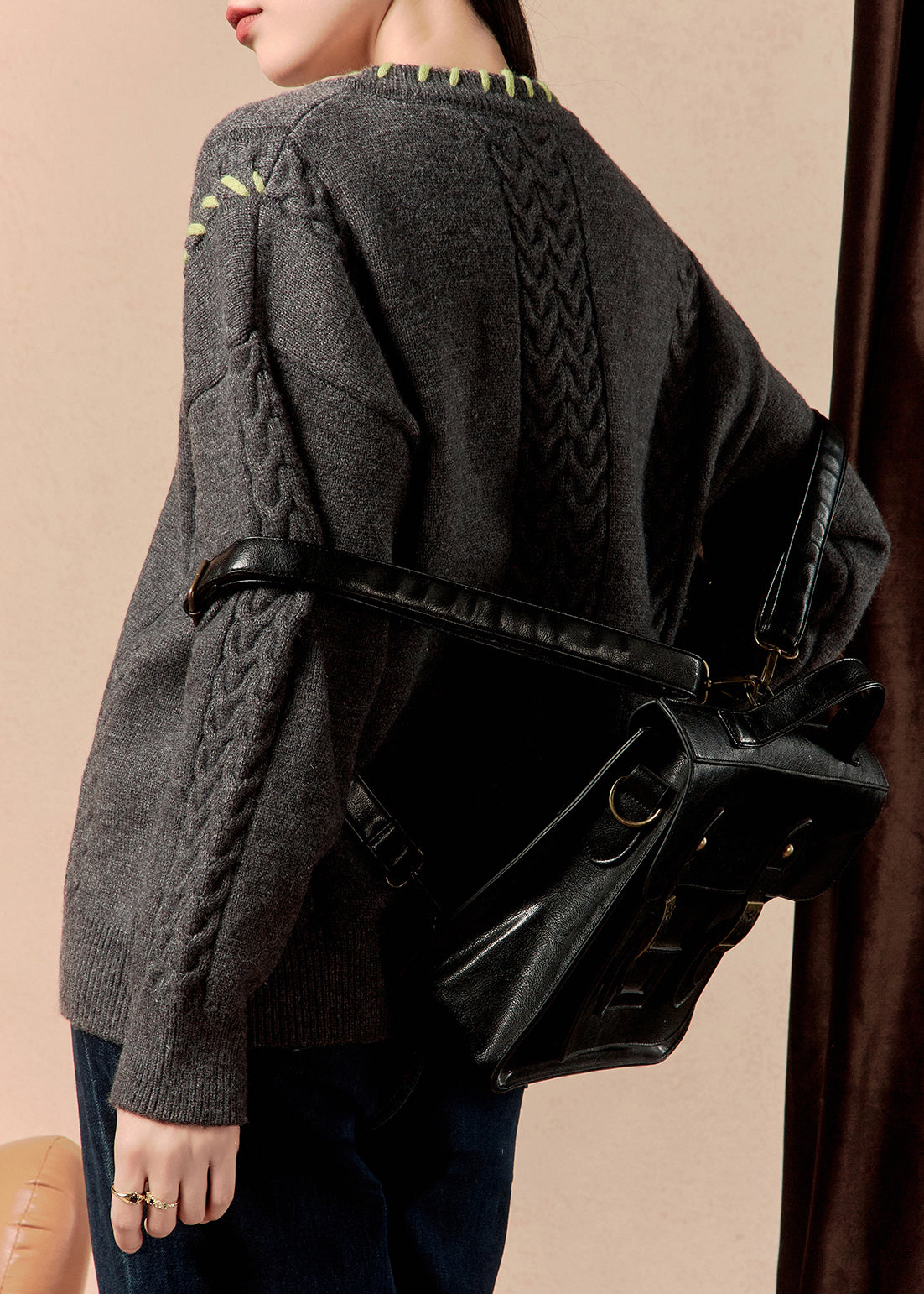 Vintage Dark Gray V Neck Cable Cotton Knit Sweater Winter