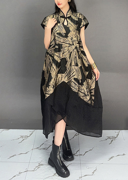 Vintage Gold Stand Collar Print Patchwork CottonDresses Summer