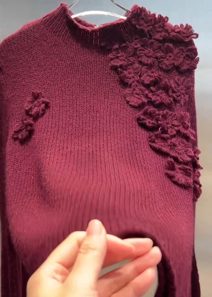 Vintage Mulberry Turtleneck Floral Cotton Knit Sweater Tops Spring