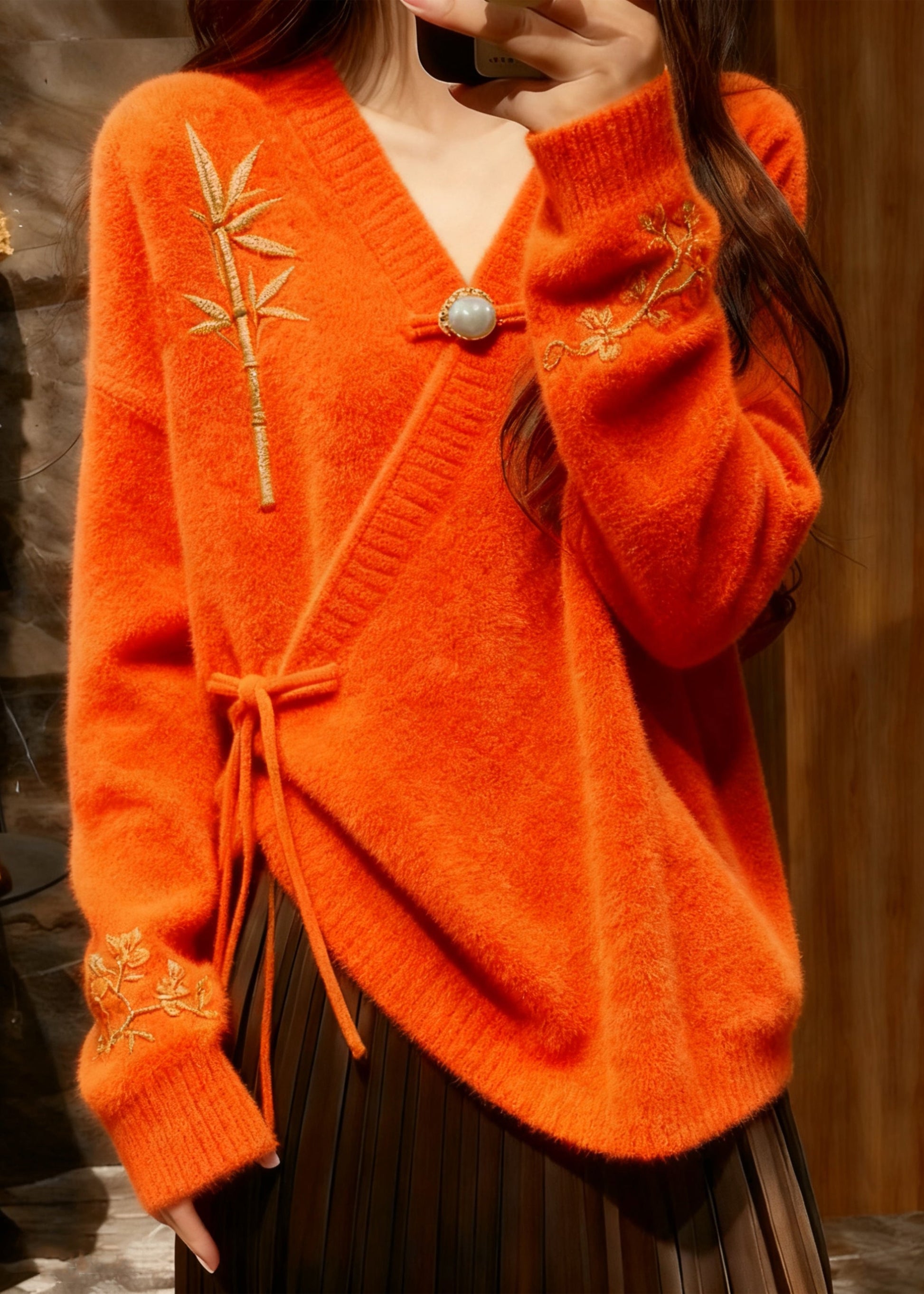 Vintage Orange V Neck Thick Cotton Knit Sweater Fall