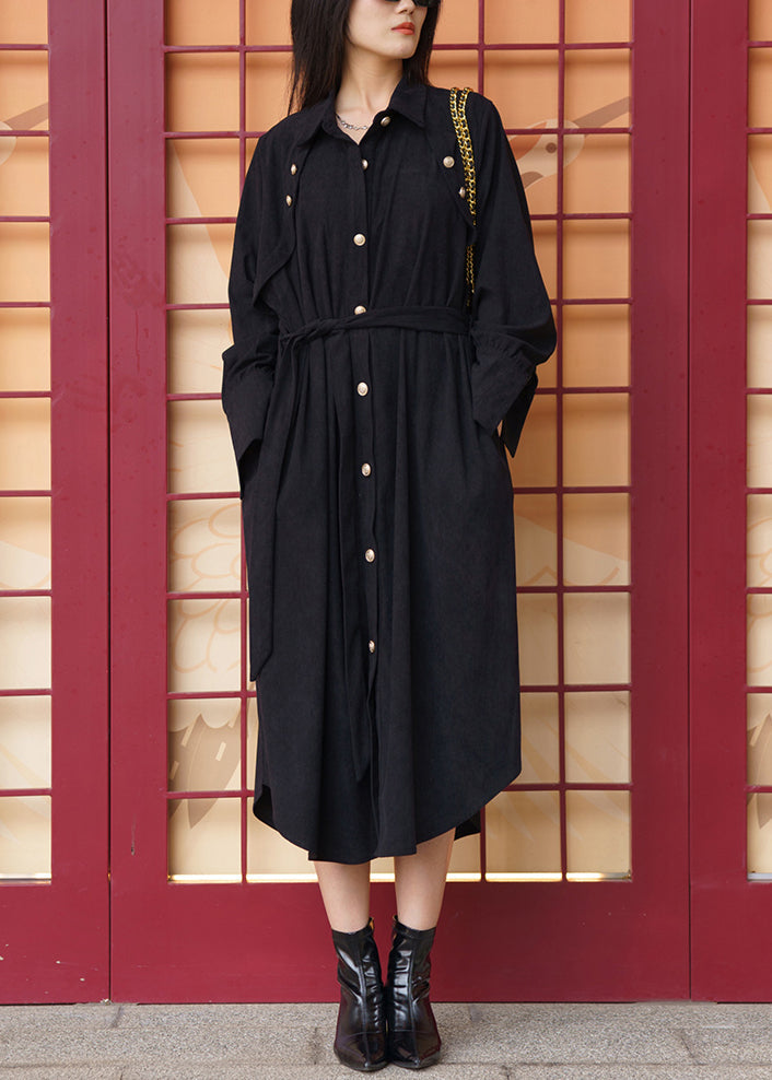 Women Black Pockets Tie Waist Cotton Shirt Dress Long Sleeve