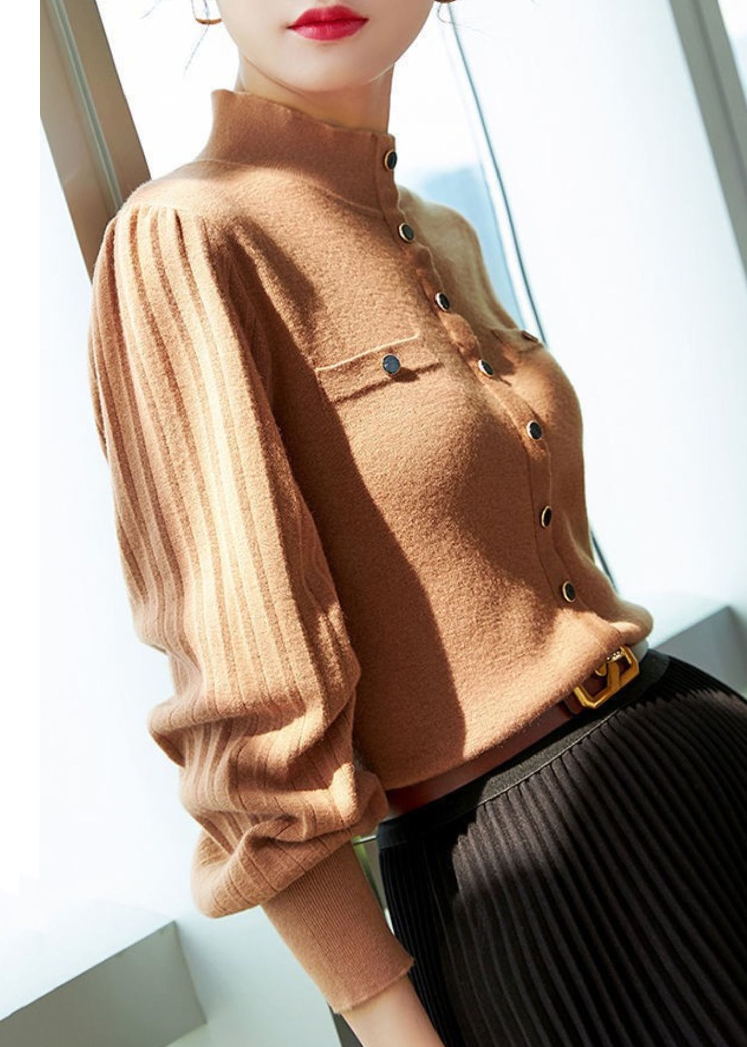 Women Camel Turtleneck Patchwork Cotton Knit Tops Lantern Sleeve