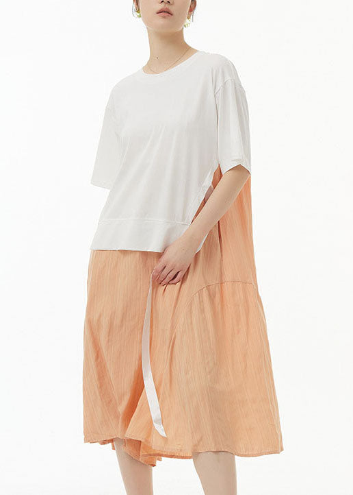 Women White O Neck Patchwork False Two Pieces Cotton Dress Summer